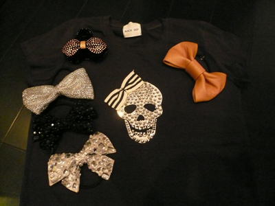 ずいぶん前から、私もリボンに夢中でしたが、このTシャツ、LAALCUBの新作です!ドクロがリボン付けてます!でっかいストーンでできたドクロの上にちょこっとリボンが付いててチョーかわいいんですよ~ちなみに、その周りに置いてみたリボンたちはここ数ヶ月で私が買ったリボンのヘアアクセたち。。。今日買ったのは右側の、なんとレザーでできたリボンのゴム。その発想にキュンッとときめきました~きょりこ