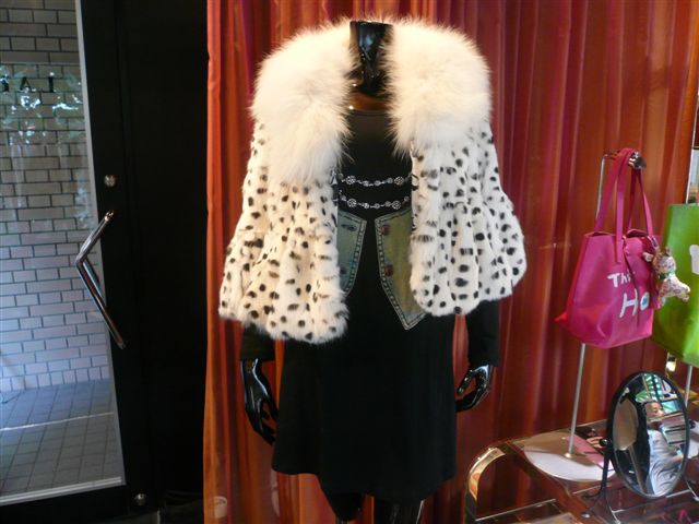 こちらのラビットファージャケット入荷しました~♪第一弾入荷分は即完売してしまったのですが、来週には再入荷決定しました!!!ひょう柄は写真の白とあとブラウンがあります~それから無地で黒とグレーの合計4色展開です!税込¥45,150です。写真の白はこれ私の私物なんですよー!実は実は私ファーってあんまり好きじゃなかったんですが、(動物愛護!?あと鼻が犬なみに異常にきくので苦手でした。。。)このファーに限ってはあまりにものかわいさにそんなことかまってられない!ってほどトキメキました!それで即買いっ!!!もうそろそろ着れそうかな~楽しみ~♪早く寒くなれーーー!