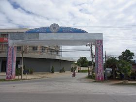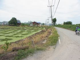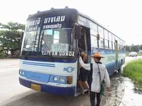 ノッパウォン交差点。来るのは3回目なんですが、なぜここに来る度に不安に駆られるんでしょうねぇ…。今回の不安の元は、これから乗るバスなのです。パトゥムタニーの船着き場近くとナコーンパトム県バーンレーンをほぼ東西に結ぶローカルなバス路線なんですが…。車体は見たことがあるんですよ。でも実際にこの路線は運行されているのか一抹の不安があるんですよね。そんなこともあって、私にとっては難度が高く、かついつかは乗るぞと密かに目指してきた路線なのです(笑)いよいよその時が来たと、期待と不安が入り混じった何とも言えない心持ちでバスを待ちます。辺りを見回しても他に待っている人など、いやしません。本当に来るんだろうか? 段々と不安な気持ちが膨れ上がっていきます。30分待っても来なかったら考えよう。そう諦めかけていた時です。突然バスが曲がって向かって来るではないですか。フロントガラスには「パトゥムタニー バーンレーン」と。間違いない!!すると今まで気配が全く無かったのに、どこからともなく乗客が現れてわらわらと私より先に乗車していくではないですか。まったくもって狐に鼻をつままれた気分… -_-;)時刻は09:46。30分に1本なんでしょうかね。実際に乗れてしまうと、あっけないもんです。でもちょっとばかりの達成感に浸れました(笑)おばちゃんの車掌が集金にやってきます。ラーンクラトゥム市場に行きたいんですが、着いたら教えていただけますか?そう尋ねると、「ラーンクラトゥム市場? ラーンクラトゥムだよね?」と自信無さ気な顔で答えてきます。知らなそうな雰囲気。そんなに無名な市場なのかな。ひとまずハイと答えて運賃8バーツを支払い。運転席真後ろの座席にはちっちゃな子どもが。なるほど! 運転手がお父さん、車掌がお母さんっぽいんですよ。家族でこのバスを転がしてるんですね ^^そんなバスは緑豊かな国道346号線を西へと疾走。途中、交差点で信号停車。ふと外を見ると「サイノーイ」との標識が。なるほど。左折して南に走ればサイノーイ水上マーケットへ出るんだな。ここにソンテオ路線でもあればいいのに~。しばらく走ったところで車掌さんが「ラーンクラトゥムでしょ? ここだよ」と。やっぱりね。ここじゃないんですよ~。地図を見るとワット・ラーンクラトゥムなんかがあるのはこの辺りなんですが。いえ、ここではなくもっと先なんです。と、iPhoneのマップを見せて説明します。きっと傍から見ると私ってウザイ乗客でしょうね(笑)そうなの?というような困った顔をした車掌さん。でも黙って様子を見てくれています。あ、運賃が変わるんじゃないですか?「マイペンライ」す、すみません ^_^;)ほどなくして地平線まで真っ直ぐ続く運河を渡りました。プラピモンラーチャー運河です!前回の日記でバーンブアトーン市場の北側で見た運河がこれなんですよ。サイノーイ水上マーケットを通ってここまで一直線に繋がっているんです。この運河、もう一回登場します ^^車窓にはのどかな田園風景が。まさか目標地点もこんな風景のど真ん中じゃないだろうなぁ -_-;)いよいよ近づいてきたので、iPhoneのマップで慎重に降りるポイントのタイミングを伺います…。着きました。車掌さんにそう告げると、ハッとした顔をして停車させてくれました。笑顔で見送ってくれます。親切にどうもありがとうございました!時刻は、10:07。田んぼのど真ん中じゃなくて良かったです(笑)さて、道路の反対側を見やると・・・あー、あの路地だな。奥へと進んだところに最初の目的地、ラーンクラトゥム市場があるはずです。なんだかゲートが立っているけど、お寺でもあるんでしょうかね。道路を渡って行ってみましょう!<交通費>バス:8バーツここまでの合計:50バーツ※旅は2012年8月13日(祝日)に行いました。つづく