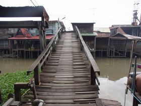 ラーンクラトゥム市場へと続くソイの入口になんとか辿り着きました。分かりやすいようGoogle Mapのリンクを貼っておきます。矢印の場所がこのソイ入口です。 (この写真は再掲です)ゲート右側のモーターサイ詰所に歩み寄ります。ラーンクラトゥム市場ってこの奥ですよね?「古い市場だろ?」とモーターサイの兄ちゃん。はい。行ってもらえますか?バイクの後ろに早速跨ります。よし、順調だぞ。両側に田園風景の広がる中を奥へとかっ飛ばして行くと、突如煙が!なんと、脇の畑で野焼きをしているじゃないですか。煙の中を突っ切ります。ゲホゲホッ。け、煙いんですがぁ… -_-;)ほどなくしてソイは行き止まりに。そこでバイクを停車させて兄ちゃん、「橋を渡って右に行くと市場だよ」と。ありがとうございます!運賃15バーツを支払うと踵を返して去って行きました…。時刻は、10:12。前方を振り向きます。そこにはこれまた味のある木橋が!なんだか武者震いしますね。向こうにはどんな景色が待ちうけているんでしょう!?橋を渡り始めます。ん? もしや下を流れているのは…そうだ。プラピモンラーチャー運河だ。間違いない!!今日お目にかかるのは三度目ですね ^^そう言えば終戦直後から約1年間、在タイ日本人が収容されていたバーンブアトーン収容所があった地、バーン・カーイ3を訪ねた時もこの運河沿いを歩きましたし、どうも私と縁のある運河なんですよね。渡り切って、木橋の全体を眺めてみます。趣がありますよね~。ヤバイ。木橋マニアになってしまいそうです(笑)ちなみに渡った先にあるのは小学校。その端にある路地をちょっと進むと右にまた路地が。これかぁ。角には雑貨屋兼駄菓子屋が。放課後には小学生たちが買い食いしてるんでしょうか?(笑)両側に住宅が建つコンクリートの路地を歩いて行きます…。どうも湿地のようですね。高床式になっている家屋ばかり。すると・・・あっ!前方にまたもや木橋が見えてきました。いよいよか!?<交通費>モーターサイ:15バーツここまでの合計:50バーツ※旅は2012年8月13日(祝日)に行いました。つづく