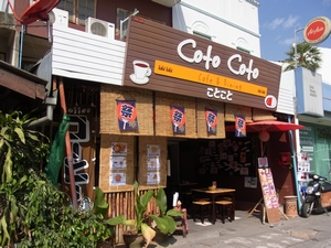 ニマンヘミン・ソイ7のバーン・タワーイというお店でカオソーイを食べ終えた私は、再び歩き始めたのでした。時刻は、09:54。同じニマンヘミン・ソイ7には、こんな店もありました。いかにもチェンマイ!って感じですよね。ソィ入口まで戻ったので、ニマンヘミン通りを南下していきます。気付いたんですが、賑やかなのはリンカム交差点からそう遠くない範囲までで、その先は大して店が無いんですね。しかもチェンマイ大学の敷地らしい空き地やら会議場の建つ敷地やらが通り沿い両側のかなりの部分を占有しているので、商店街を作ろうにも作れない感じ。もったいないですよー。チェンマイ大学にはぜひチュラロンコン大学がサイアムスクエアを整備して貸し出しているみたいに、ニマンヘミン通り沿いを開発してほしいですね。ようやく先にニマンヘミン通りの終わり、ステープ通りとの交差点が見えてきました!ところで目の前を通過しているソンテオ、「無料 チェンマイ大学-スアンドーク 22」と正面に書いてあるんですよ。例の路線ソンテオではなさそうですが、通学用ソンテオか何かですかね?で、交差点到着。時刻は10:09。ソイ7に寄り道した時間を差し引くと、リンカム交差点から19分でニマンヘミン通りを端から端まで踏破したことになります。さて、交差点から右手を眺めると、ステープ通りが山へ向かって西へと伸びています。で、もう左折するポイントは見えてますね~。早速歩いていきましょう。ほんの1,2分でそのサナームビンガオ通り入口に到着。車の列にならってここを左折したところから見た景色が、これ。正面にあったー!Tuiさんのお店「Cafe & Dining COTO COTO」です。良かった。一時はどうなることかと思いましたが、辿り着けました!時刻は、10:12。店内を覗き込むと、Tuiさんが温かく出迎えてくれました。では、お邪魔しまーす ^^洗練されたいい雰囲気の店内ですね。もちろんエアコン完備。壁沿いのテーブルは、カップル席でしょうか。タイ人カップルって向かい合うよりも並んで座るのが好きみたいですから、その点も考えてのことなのかもしれませんね。ディナータイムに近所のチェンマイ大学生のカップルが仲良く並んで食事している光景が目に浮かびそう(笑)実はどんなメニューがあるのか全く知らずに訪れたんですよ。Tuiさんから手渡されたメニューを開いてみると、1ページ目にオムライスが!しかも「トマトソース」は普通だとして、「グリーンカレー」と「マッサマンカレー」って一体!?「人気メニューなんですよ」とTuiさん。ではそれにしてみますか。どうせなら「マッサマンカレー」のほうで ^^で、シェフ長の奥さまの手による料理がやって来ました!オムライスとマッサマンカレーが本当にコラボしてる!いただきまーす。うん、なんとも不思議なんですが、絶妙にこの2つがマッチしてますよ。優しい味わいです。単体でもそれぞれ美味しくて、とくにオムライスの卵焼きの部分は物凄くフワフワで絶品。こりゃ人気メニューなわけだ。他のメニューは日本の洋食がメインで、タイ料理もありますよ~。☆お店情報☆Cafe & Dining COTO COTO地図:グーグルマップ(赤いピンの場所)住所:4/1 Sanambinkao Rd., T.Suthep, Amphoe Muang, Chiang Mai電話:053-282-005、日本語は098-852-0334※お店への行き方ですが、空港からでもチェンマイ市内からでも、赤いソンテオに「タラート・トンパヨーム」(ตลาดต้นพยอม)と告げるといいです。上の写真のサナームビン・ガオ通り交差点で下車して徒歩すぐです。タラート・トンパヨームは交差点の100mほど先です。<旅費交通費>歩いただけなので:0バーツここまでの合計:2,218バーツ※旅は2015年2月18日(水)に行いました。つづく※当ブログから1日旅の記事だけを抜粋し見やすくまとめたブログ『タイ~バンコク周辺バス日帰り旅~』 もぜひご覧ください。そちらのブログは左側の「旅ごとに見る」欄で旅名を選ぶと順を追ってお読みいただけます。旅の参考になれば幸いです。★★★お薦めのタイ語学習書です★★★ ◇ 初 級 ◇ 『あなただけのタイ語家庭教師』国際語学社 ◇ 中 級 ◇ 『中級タイ語総合読本』白水社 ◇ 上 級 ◇ 『タイ語上級講座読解と作文』めこん