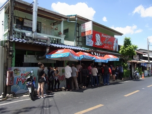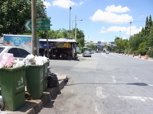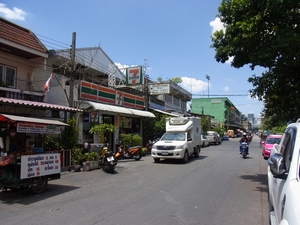 「クロントイ・スラムへ」を再開します!大人気の食堂「ジェー・ジョン」で食事を終え、トイレを借りるために一旦ロータスに立ち寄った私は、再びジェー・ジョンの前に戻ってきました。うおー。相変わらずの行列ですね。1時間後のお昼時にはどうなっちゃうんでしょうか。ジェージョンの目の前の道を左、つまり東へと歩いていってみます。時刻は11:00。左側は長屋ビルが連なっているんですが、右側は相当粗末な木造家屋がゴチャゴチャっと続いています。半ばスラムですね。ちなみにこの真っ直ぐな道は、タノン・ターン・ロッファイ・サーイガオ、訳すと「廃線通り」。その名のとおり、かつてここには鉄道が通っていました。しかも国鉄のフアランポーン~アユタヤ間開通よりも早い、タイ初の鉄道路線だったんですよ。開業は、1893年4月11日。新橋~横浜間鉄道開業の21年後のこと。フアランポーン駅向かいからパークナムのウィブーンシー船着場(プラサムット・チェーディーへの渡し船)前までの21.3kmを約1時間で結ぶ路線で、パークナム線と呼ばれていました。デンマーク人がオーナーの民間鉄道会社で当初はドイツ製の蒸気機関車が客車を牽いていましたが、のちに電化。日本車両製の電車が4両編成で走っていたそうですよ。50年間の事業権が切れた後は国鉄の所有に。かつて外航船は水深の浅いチャオプラヤー川を遡上できず河口に停泊したので、船員のバンコク間の往復などでそれなりの需要があったようです。でも戦後のチャオプラヤー川浚渫とクロントイ港開港の影響か、乗客数が減り、ついに1960年1月1日、時のサリット首相の命令で廃止に。フアランポーン駅付近の線路跡は並行する運河とともにラマ4世通りの拡幅用地と相成ったのでありました。で、ラマ4世通りから分岐した先は、このとおり廃線通りとなり、巨大なゾウの像で有名なエラワン・ミュージアム付近まで続いています。ケムいなと思ったら、先でおばちゃんがガイヤーンを焼いていました(笑)しかし思ったより長い道で、歩き始めたことを後悔し始めましたよ。右手に高速道路が迫ってきました。直下はドブの運河のはず。この辺の屋並みはまったくもってスラムですね。なんて思っていると目の前に、引越しは日通!?日本語のままじゃないですか!NIPPON EXPRESSとの看板が掲げられています。日本通運さんの営業所はこんなところにあるのか。そうか。クロントイ港至近ですもんね。そのすぐ先の左手には、大きなお屋敷が。廃線通りを挟んだ左右の屋並みのマリアナ海溝級なギャップに映画『ブレードランナー』の世界をつい思い出してしまいました -_-;)ずっと交わる道が無かったのですが、ようやく遠く先に交差点が見えてきましたよ。ちなみに左手の白いビルは、私立のバンコク大学です。ようやく交差点に出たー!時刻は11:23。ジェー・ジョン前から20分あまり歩いたのか。しかし行き来する車は、トレーラーばかり!交差点に出て右を見た光景なんですが、あの正面にあるクロントイ港のゲートからトレーラーがひっきりなしに出入りしています。この辺の空気悪そうだな ^_^;)あ、そうだ。ちょうどいいや。炎天下歩いて疲れたので、バンコク大学で一服しますか。<旅費交通費>歩いただけなので:0バーツここまでの合計:14.5バーツ※旅は2014年9月19日(金)に行いました。<参考>Wikipedia "ทางรถไฟสายปากน้ำ"つづく※当ブログから1日旅の記事だけを抜粋し見やすくまとめたブログ『タイ~バンコク周辺バス日帰り旅~』 もぜひご覧ください。そちらのブログは左側の「旅ごとに見る」欄で旅名を選ぶと順を追ってお読みいただけます。旅の参考になれば幸いです。★★★お薦めのタイ語学習書です★★★ ◇ 初 級 ◇ 『あなただけのタイ語家庭教師』国際語学社 ◇ 中 級 ◇ 『中級タイ語総合読本』白水社 ◇ 上 級 ◇ 『タイ語上級講座読解と作文』めこん