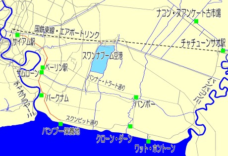 インペリアル・サムローン横のロッ・トゥー乗り場でクローン・ダーン行きロッ・トゥー乗り場はバンコク銀行横だと教えてらったのですが、そのバンコク銀行の場所がわかりませんよー。そうだ。歩道橋から眺めてみるか。さっき渡ってきた歩道橋に戻ってみると、あった(笑)屋根の上の青地に白い線でハスのつぼみのようなマークが描かれた看板がバンコク銀行です。タイの銀行って、屋上に建てた火の見櫓みたいに背の高い塔の上に看板を設置するので、遠くからでも一目瞭然ですね。しかしあんな遠くに乗り場があるなんて、聞かなきゃ絶対に見つけられませんでしたよ。バンコク銀行を目指してスクンビット通り沿いの商店街を歩きます。以前はここでバスやソンテオの乗降ができたんですよ。どうもバンコク銀行寄りのほうへ移動したようです。お、見えてきた。あそこだ。バンコク銀行サムローン支店は、商店街のはずれに建っていました。ちなみに銀行ビルの手前の路地には、ここにもロッ・トゥー乗り場があるんですが、これはスパンブリー行きでした。こんなところからスパンブリーまで出てるのか。バンコク銀行の向こう隣はスーツ仕立て屋で、その先の路地を覗くと、いた!クローン・ダーン(คลองด่าน)行きのロッ・トゥーです。やっと辿り着けましたよ~。時刻は、09:41。帰ってからグーグル・ストリートビューでこの場所を確認したら、クローン・ダーン行きロッ・トゥーがしっかり写ってました(笑)乗車して間もなく、09:43に出発。当初乗客は私ともう一人の男性だけでしたが、スクンビット通りで数人が乗車してきました。頭上を建設中のBTS高架橋がずっと続いています。途中で物凄く高く伸びているところがありましたが、ちょっとあれは乗るの怖いぞ。そして、パークナム名物、サムットプラーカーン県庁の時計塔が右手に。ここで左に折れてスクンビット通りをそのまま走行。ほどなくしてやはり右手に見たことのない建造物が。えっ、タワーを建設中なの?これも帰ってから調べたところ、サムットプラーカーン展望タワー(หอชมเมืองสมุทรปราการ)と言うんだそうです。高さは179.55メートル。建設計画は15年ほど前からあったのですが、2012年9月22日に起工式が執り行われようやく建設開始。で、2015年11月には完工予定でしたが、まあいつものことで終わってないと ^_^;)最新情報では、今年2016年4月には建設工事が完了し、その後内装を終えて今年中にオープンできる見込みだとか。ちなみに建設している場所を調べてビックリ。なんと以前訪れた、中央刑務所跡地公園内なんですよ。グーグルマップで場所をお知らせしておきます。オープンしたら絶対来てみよっと。この辺りから渋滞に巻き込まれたものの、BTS高架橋が右へと逸れていった(車庫かな?)頃には道も空き、再び飛ばして走っていると、バンプー保養地の入口前を通過しました。1941年12月8日未明に、日本軍が奇襲上陸した地だということは以前このブログで書きましたね。バンプー保養地の場所もグーグルマップで示しておきます。半分くらいまでは来たかな。この先は未踏の地。ワクワクします!<旅費交通費>ロッ・トゥー:70バーツ?(メモるの忘れました)ここまでの合計:130バーツ?※旅は2015年11月19日(木)に行いました。<参考>องค์การบริหารส่วนจังหวัดสมุทรปราการ ข่าวสาร อบจ.つづく※当ブログから1日旅の記事だけを抜粋し見やすくまとめたブログ『タイ~バンコク周辺バス日帰り旅~』 もぜひご覧ください。そちらのブログは左側の「旅ごとに見る」欄で旅名を選ぶと順を追ってお読みいただけます。旅の参考になれば幸いです。★★★お薦めのタイ語学習書です★★★ ◇ 初 級 ◇ 『あなただけのタイ語家庭教師』国際語学社 ◇ 中 級 ◇ 『中級タイ語総合読本』白水社 ◇ 上 級 ◇ 『タイ語上級講座読解と作文』めこん