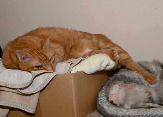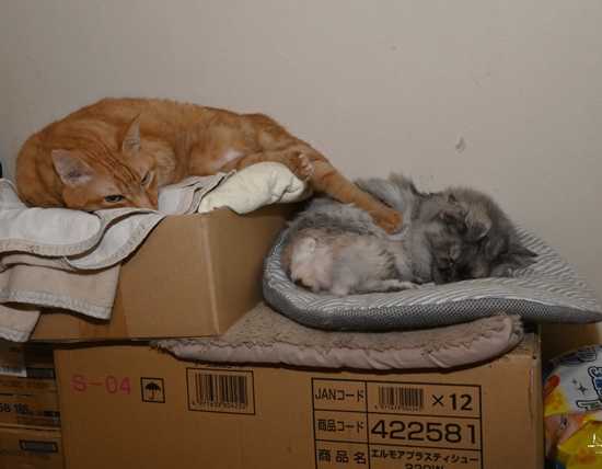 パッと見は、ラモが、ロンに足蹴にされているように見えますが、恐らくは、ロンが上の箱に居る所へ、後からラモが下の箱の上のクッションに上がって寝た模様。