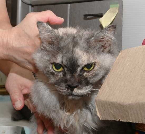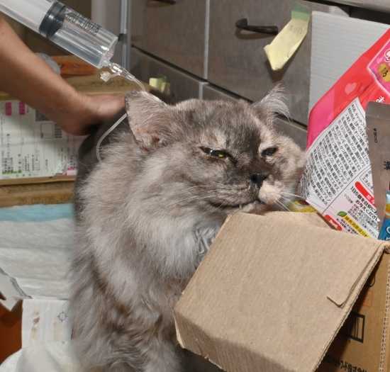 皮下補液されながら、ダンボール箱の角で、顎をゴシゴシ