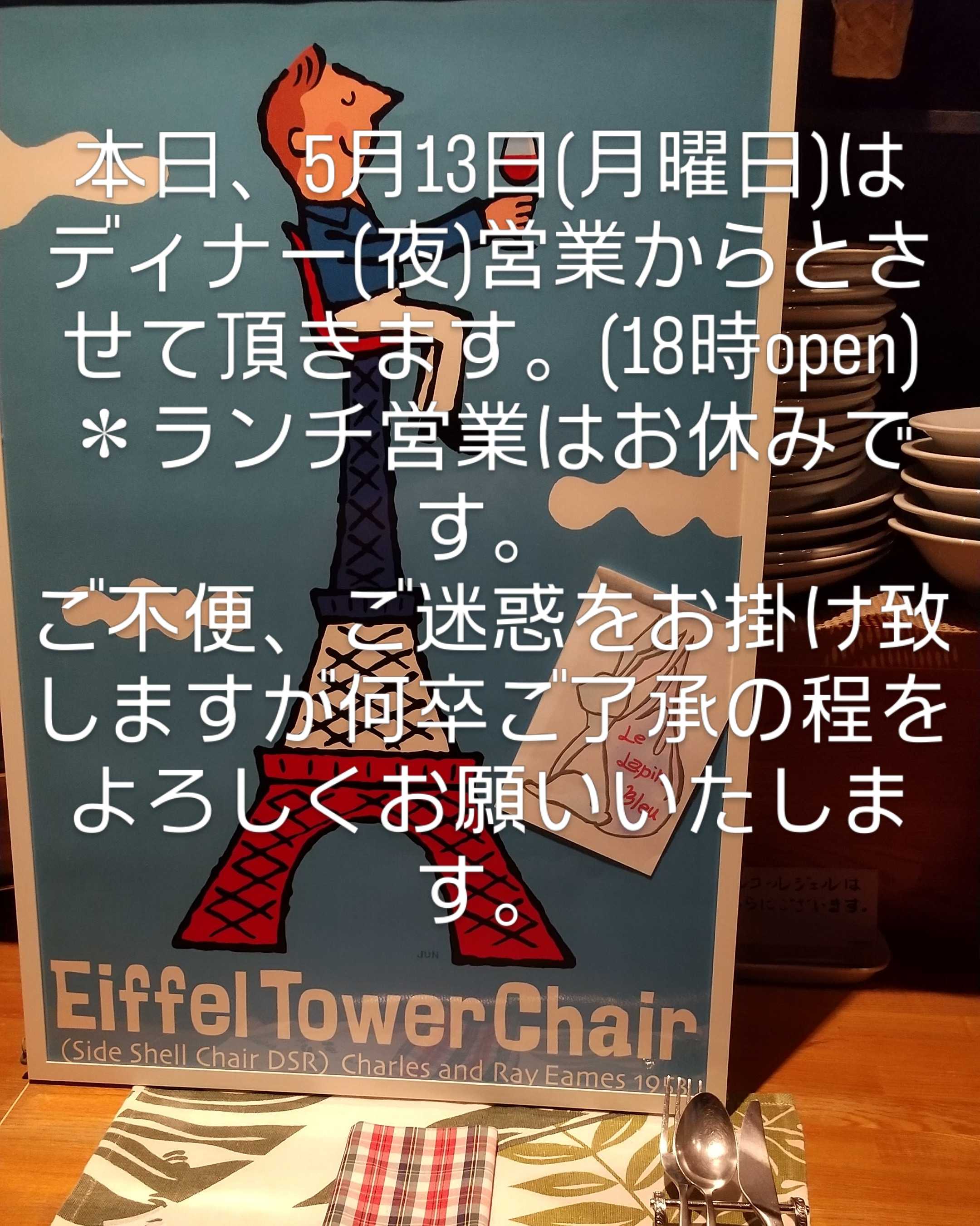 お客様各位。 誠に勝手ながら本日、5月16日(木曜日)のランチ(昼)営業は仕込みの為、お休みさせて頂きます 申し訳ございません。尚、ディナー営業(18時~open)は通常通り営業させて頂きます。 ご了承の程をよろしくお願い申し上げます。店主