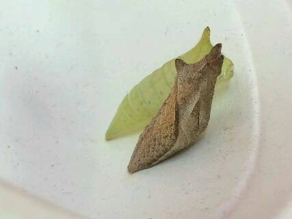 去年の秋、利用者さん(デイサービス)が採ってきたサナギ。発泡スチロールのお椀の中で冬越し中でした。ところが1月24日の朝、孵化してしまいました。きれいなアオスジアゲハです。室内で干からびてしまうのも憐れ、外に放しても真冬、どうしたものか迷いましたが、やはり自然に返すことにしました。洗濯ネットで虫捕り網を作って捕獲、とりあえず元気に咲くパンジーの寄せ植え鉢に置きました。1日でも長く生きながらえてと祈って。今、わが家の庭に持ち帰ればよかったと後悔しています。ストック、パンジー、バラなど、あの場所よりはるかに花が多かったから。