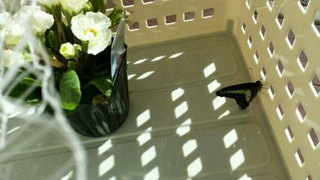 休みのあと出社すると、パンジーの鉢で動かなくなっていたと、アオスジアゲハは室内に移され天井にとまっていました。スタッフ協議の結果、わが家に養子に出すということになりました。ダンボールに洗濯ネットを被せて持ち帰り蝶の部屋を作りました。プラスチックのカゴに果実の鳥よけ網です。餌はティッシュに含ませたスポーツドリンクネットで調べたやり方で吸わせました。蝶の成虫の平均寿命は、種類によって6日から3週間ということです。100個の卵のうち羽を広げて羽ばたくことのできる蝶は0.6%だということ。できるだけ長生きさせてやりたいと思います。