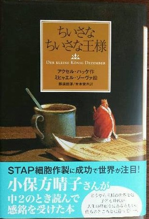 今日はお休み。テーブルの上の散らかり、棚の埃から目をそらし、朝の時間は読書にあてました。誕生日月は5%値引きという書店で何冊か購入した中の1冊『ちいさなちいさな王様』。STAP細胞の小保方さんが中2のときに読書感想文を書いて賞をとったということで改めて知られるようになった本です。17枚の挿絵を含めて109頁、お茶を淹れたり洗濯機のスイッチを入れたりしながらの読書でも2時間もかからず読めてしまいました。面白い本でした。「僕」と「王様」の会話の中で、「人生とは?」と考え始める中学生なら読み取れるヒントがふんだんに語られています。だからといって子供向けというわけではありません。私ももう一度読み返したいと思っています。私にはもうひとつ楽しい発見がありました。挿絵の中の1枚を持っていたのです。もちろん原画ではありせんよ。昔アートギャラリーで手に入れたカードです。写メの色が悪くて残念です。ミヒャエル・ゾーヴァの油絵で、彼は映画「アメリ」の小道具や絵を担当した画家だとか。「アメリ」も好きな映画です。おまけに「ちいさい」繋がりで。人生初の愛読書はバージニア・リー・バートンの『ちいさいおうち』でした。映画の『小さいおうち』でも、一瞬ですがこの絵本が登場していました。