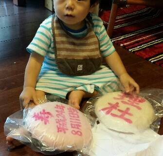ご無沙汰の言い訳にしかなりませんが、8月は文字通り「あっというまに」過ぎてしまいました。先週は朝の目覚めがもうひとつスカッとしなくて、「夏バテ?」なんて思いました。皆様お変わりなくお過ごしでしょうか。まだまだ終わりそうにない残暑、お見舞い申し上げます。8月の思い出写真を1枚。帰省した長男の長男の1歳のお誕生日です。「一升餅」はテレビでしか見たことがありませんでしたが、彼らの帰省する前日、届きました。提案したお嫁さんも経験がなく、「ネットで買えそうね」と言ったら、本当にネットで注文しちゃって…(笑)最近の若い人は、伝統の掘り起こしがお好きなようです。ママ友さんは、皆さんこれを楽しまれているそうです。「恵方巻き」だって、息子たちが小さい頃はなかった思います。私にはいわゆる「田舎」がなく、体験が足りないせいかもしれませんが。「一升餅」を背負わされ、予想通り長男の長男は大泣きしました。まだ自分の体を支えるのもやっとのよちよち歩きですから。「一生食べるのに困らない」「丸く円満な人生を送る」「人生の重さを知る」などなど、いろいろいわれはあるようです。「背負ってすたすた歩く子は親離れが早い」ということで、わざと転ばせたりするそうですね。(まあ、随分親の勝手だこと)以前、孫に自分をなんと呼ばせますかとお聞きしたことがあります。私は「ばあば」と呼ばせたく何度か教えましたが、今のところ私は「おたあたん(おかあさん)」です。まわりのみんなが私を「おかあさん」と呼ぶのに、「ばあば」と呼ばせるのはまだ無理がありました。