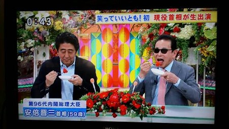 祭日なので、ご覧になった方も多いでしょうね。『笑っていいとも テレフォンショッキング』出演中の安倍首相です。安倍首相の3月21日の行動記録に、「いいとも出演後、タモリと会食」と残したいというタモリの希望にそって会食中(苺)のショットです。お二人とも楽しそう。『笑っていいとも』も、いよいよ過去の番組になるのですね。タモリは一度も「やめたい」と思ったことがないそうです。それってスゴイ!私は人生で何度も辞めたいと思って辞めました安倍さんは「増税首相」として名前が残りそう。皆さん、駆け込み消費していますか。私は全くしていないのですが、今日は2、3ヵ月に1度のまとめ買いに行って来ました。愛用の白バルサミコ酢がこの辺りでは手に入らないので、前に住んでいた街まで車で買いに行っています。増税前セール? をやっていたので買い込んできました。消費の激しいオリーブオイル、メープルシロップ、パスタソース。先週、市役所で行われた上野千鶴子さんの講演会に行ってきました。初めて上った展望台から暮れ落ちる夕日に浮かぶ富士山が望めました。