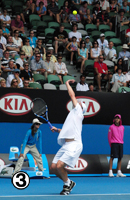 最近は、サーブの調子がいいなぁ。と思っていたのですが、先週の土曜日は、極度の不振。。。 1ゲームで 2つエースの4ダブルフォルト。 みたいな乱調ぶり(^^; ということで、雑誌でプロの写真などを見て、自分のフォームを再現してみて、原因を考えました。 で、気づいたんですが、自分は、サーブの時、『ベタ足』ナンデスよね(^^;いままで気にもしてませんでしたが。。。 でも、下の写真のロディックをはじめ、プロは、踏み切る直前、『つま先立ち』になっているのです。 で、『つま先立ち』でサーブを打ってみました。 なるほど、バランスを取るのが難しいために、体軸をまっすぐに保たないと サーブが打てない(こけそうな感じになる)感じです。 しかし、しっかり体軸を保てた場合は、蹴り上げる力をボールに伝えられるようで、「速さ」・「回転」ともに UP していい感じですね。 うまく打てない時はサーブ動さを中断し やり直す。という感じで 慣れていけば、精度・威力ともにUPできそうな気がしてきました。 しばらくは、この意識で練習してみたいと思います。