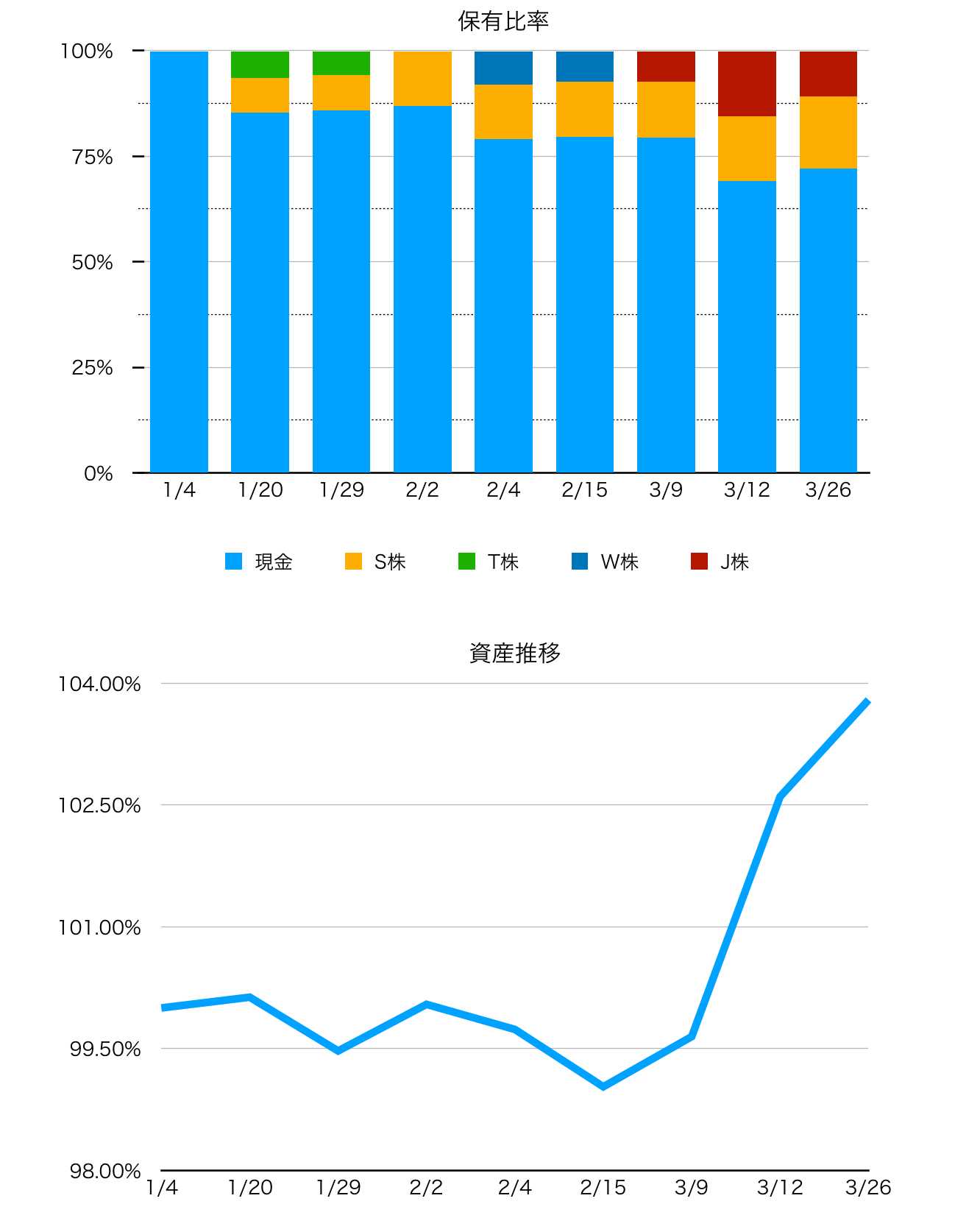 「何年かかったっていいんだよ。みんな悩んで大きくなるんだから。」(仮面ライダー クウガより)こんにちは「レオなるど」です。四半期の振り返り。取引回数13回。昨年の資産推移のブログは毎月でしたが、四半期にしてみました。その方がブログも楽ですし、僕の投資スタイル(&サボり癖)からも時間軸でそれくらいの方がいいかなと。まだまだ迷走中な僕です。悩んで大きくなります!↓1〜3月の資産推移です。ちょっとグラフも変えてみました。もっと「こうしたら分かりやすいよ」とかあれば教えてください🙇♂️。まず1・2月の伸びない要因に年越しをノーポジで過ごした事。ほぼ1ヶ月ノーポジ。メンタル的にはノーポジはサイコーですが、相場の波や風を感じる肌感から離れすぎると再エントリーに躊躇してしまいます。日経平均は年末の27,000円から1月中旬に29,000、調整して2月中旬に30,000と、一度波を逃すと難しく。成長株、マザーズはさらに難しい相場でした。銘柄ではバルミューダ6612、スノーピーク7816、MacbeePlanet7095に乗れなかったのは痛手です。、、、おっと、あまり思いすぎるとタラレバ祭りになりそうなので。あくまで次への反省点。ま、視野は悪くない事は確認できた期間だったかな。「今年は取引銘柄や幅を増やして」って思ってたら折角の自分のエッジすらも浅くなってしまってた感じです。深ければいいってことでは無いんでしょうが。やはり自分はメンタルを重視し、自分を理解し出来ないことに無理をしないように地道に経験を積んでいくべきだと思いました。うまくいってればキャッシュポジも今の75%くらいから減らして責める事も出来るので。4,5,6月も頑張って行きましょう!!本日の レオなるど でした。