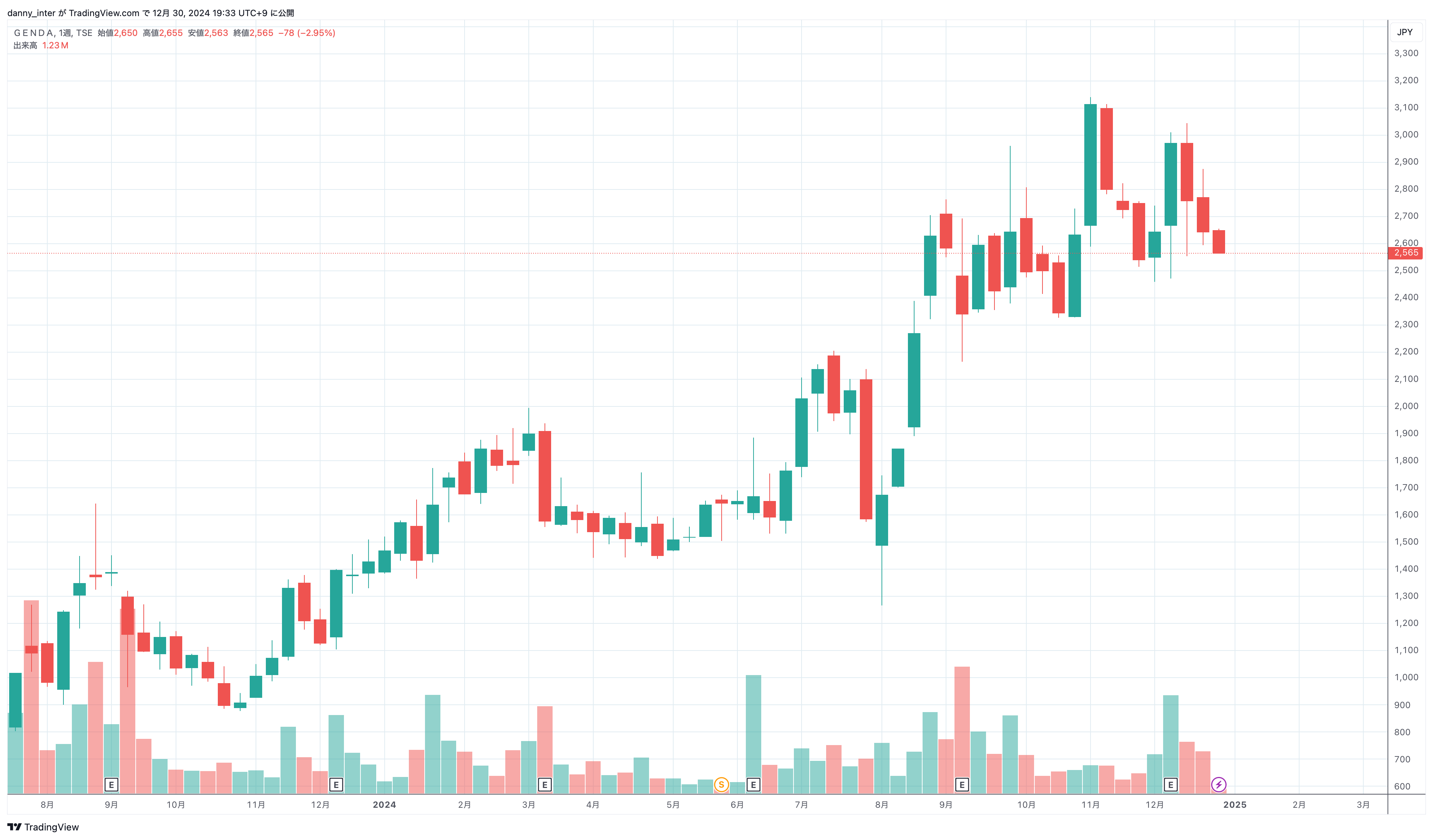 2024年の株取引を振り返る: GENDAの反省と学び今年も株式市場でさまざまな経験を積みましたが、特にGENDAに関する取引は、多くの学びと反省を残しました。このブログでは、失敗の背景や成功したポイント、そして得られた教訓について振り返ります。同じような状況に直面している投資家の方々に少しでも役立てば幸いです。:GENDAを選んだ理由(23年9月発表銘柄)GENDAは、全国のアミューズメント施設でゲーム機を展開し、クレーンゲームやキャラクターライセンス事業など多角的に成長しています。その中で以下の点が魅力的に映りました。- 市場の可能性:プライズゲーム市場はコロナ禍前から拡大を続け、アニメ需要の成長とともに今後も有望。- 急速な成長:2019年の売上4億円がGIGOのM&Aにより2023年には461億円まで成長。- 経営陣の実力:イオンファンタジーやスクウェア・エニックスなど経験豊富な経営陣による戦略的な運営。- DXと業務効率化:景品管理のDXや従業員用アプリの導入で、業務効率と顧客満足度を向上。これらの理由から、長期的な成長が期待できると判断しました。:目標株価の設定と算定根拠GENDAについては、以下のような目標株価を設定して取引を進めました。(23/9/2時点)23年決算売上461億のうち431億93%がアミューズメント施設運営。1Q売上120億、1Q以外のQは売上増の業界。夏冬+5%と施設増分+3%で今期売上520億予想する。直近の営業利益率は10%なので24年営利52億、25年は+10%成長の営利57.2億。現在予想営利43億で営利倍率22倍。1. 短期目標株価 - 2025年の営業利益予想57.2億円に基づき、営利倍率22倍を適用。 - 目標株価:1,852円(上値+37.29%)2. 長期目標株価 - 2026年の営業利益予想62.9億円に基づき、同じく営利倍率22倍を適用。 - 目標株価:2,036円(上値+50.96%)3. 最低限目標株価 - 2024年最終益予測は売上比率7.3%。 25年EPS124とし現在PER26.2。 - 目標株価:1,624円(上値+20.39%)これらの目標株価を基に、長期的な視点での成長を見込みましたが、実際の取引では思ったように成果を上げることができませんでした。:IR取材から得られた情報GENDAについての理解を深めるため、IR部門への問い合わせを行い、以下のような重要な情報を得ました。①事業の強み - 都市駅前、ショッピングセンター、郊外ロードサイドの3つの店舗形態を持ち、柔軟な出店戦略が可能。 - M&Aを活用した事業拡大とPMI(統合プロセス)での強み。②競合他社との比較と課題 - 国内ショッピングセンターにおけるシェアは相対的に低いため、シェア拡大を目指している。③市場のトレンド - ゲームセンター市場は縮小傾向に見えつつも、アニメ需要やプライズゲームの人気により成長基調にある。④DX戦略 - 景品管理のDX化によりコスト削減と効率化を推進。 - 従業員用アプリの導入で、業務時間を削減し、顧客対応に注力可能。これらの情報を踏まえ、企業の成長ポテンシャルには引き続き期待しています。:株価推移の重要なポイント取引を進める中で、GENDAの株価推移にも注目していました。- 上場直後:2023年10月30日の最安値877円から翌年11月8日の最高値3,140円まで急上昇。この急激な値動きにうまく対応できなかったことが反省点です。- 今年の動向:再び新高値を更新する銘柄でありながら、相性やタイミングの悪さから十分な利益を上げられませんでした。株価の大きな上昇を見せたものの、自分の判断ミスや動きの遅れが収益に直結したことを痛感しました。:自分がセガを熟知し愛していた点GENDAを選んだ背景には、もともとセガのゲームやアミューズメント文化を熟知し、長年愛していたことがあります。セガが築き上げてきたブランド力やゲームセンターの魅力を基盤に、GENDAがどのようにそれを発展させていくのか非常に興味深く見守っていました。:株取引の失敗とその理由しかし、期待とは裏腹に、取引ではいくつかの大きな失敗を経験しました。1. 慣れないIPO銘柄で値動きを読み切れなかった 上場直後の激しい値動きに翻弄され、適切なタイミングでのエントリーとエグジットができませんでした。結果的に短期的な損切りを余儀なくされました。2. 再エントリーでの判断の遅れ 今年に入って株価が再び上昇したタイミングでも、即座に対応できず、機会損失を生みました。3. 急激な市場変動への対応不足 23年9月11日の大幅下落に対応しきれず、心理的な影響で損切り判断が遅れたことも痛手でした。:成功した点目標株価の達成 初期の目標株価には到達。結果的には上昇銘柄を見つけた事:得られた教訓今回の取引から、いくつか重要な教訓を得ました。1. IPO銘柄には慎重に 上場直後の銘柄は値動きが激しく、情報収集と冷静な判断が不可欠です。2. タイミングの重要性 市場の変動に迅速に対応できる体制を整えることが重要だと感じました。3. 長期目線を持つこと 短期的な値動きに一喜一憂せず、企業の成長性やビジョンに基づいて判断するべきでした。:まとめ:未来への展望GENDAは、今後もアミューズメント市場で成長を続ける可能性が高いと考えています。