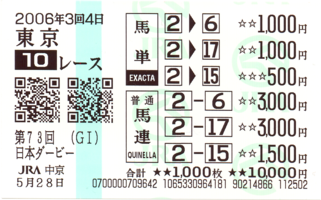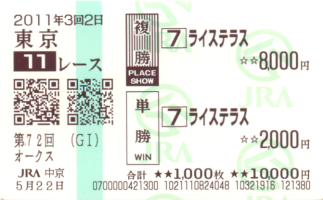 オークスの私の予想は、まだ白紙・・このオークス、私は過去にあまり当たっていないような気がしていたがたまに当たっていたようだ・・相性が良いとは言えないけど。去年は、アパパネもサンテミリオンも買っていないが、アグネスワルツの複勝で。カワカミプリンセスのときは、アサヒライジングの複勝で。馬券の画像は無いが、シーザリオのときは馬単で。それ以前は、記録をつけていないので記憶に薄いがずっと当たってない気がする。チョウカイキャロルくらいまで遡らないと・・今年は、マルセリーナ2冠達成?当初、堅くマルセリーナの単勝にしようとも思っていたが、たぶん買わない。