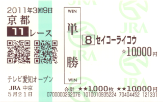 今日は2つ京都でのテレビ愛知オープンと、メイステークス。テレビ愛知オープンは、セイコーライコウの単勝1点!メイステークスは、ダンツホウテイの複勝1点。たまに当たっても安いのばかりだし、最近また当たらなくなってきたので今日あたり当たってくれないと・・