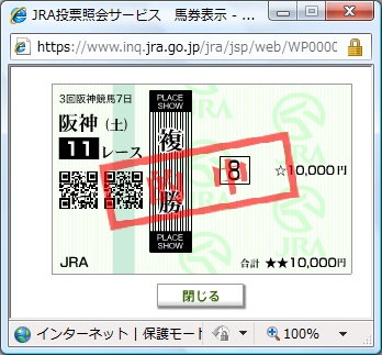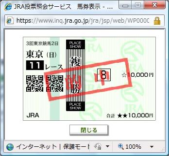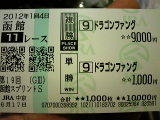 今月から新しい仕事。全く違う仕事。日曜から和歌山へ出張で、帰ってきたところ。明日(今日)は5時起きそういえば、適当予想でPATで買った安田記念、コスモセンサーの複勝ゲット~!ストロングリターンの単勝にしようか悩んだが、どちらも当たっていた。オッズ的には、コスモセンサーで正解寝よぅ
