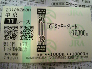 今週、PATを含め土日で4つ購入結果は、全部ダメ・・エルムSは、エーシンモアオバーの複勝朱鷺Sは、レオプライムの単勝キーンランドCは、テイエムオオタカから馬連2点。ダッシャーゴーゴーとドリームバレンチノへ小倉日経OPは、人気薄のダイシンプランの単複