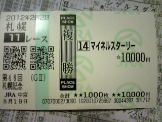 今日は、札幌記念と北九州記念を購入札幌記念は、洋芝得意のマイネルスターリーの複勝北九州記念は、高齢のサンダルフォンの単複どちらも全然ダメ・・