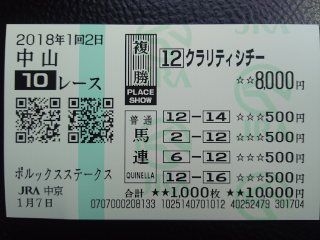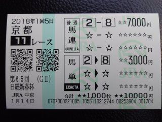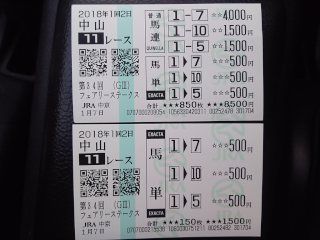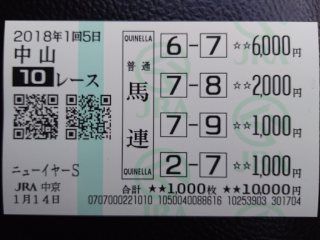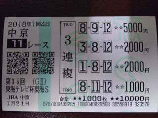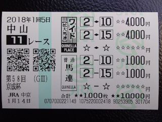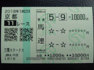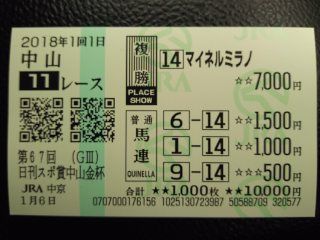 日経新春杯は、ロードヴァンドールからミッキーロケットへの馬単と、同じ目の馬連を各1点。ロードヴァンドール 4番人気2着ミッキーロケット 2番人気4着(ハズレ)WIN5 1×1×5×1×1=5点(ハズレ)