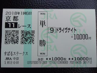 すばるSは、ドライヴナイトの単勝4番人気1着(的中 730円×100)土曜だけど珍しく今日休みだし、馬券買いに行って、来場者ポイントキャンペーンで、Today'sチャンス賞が当たったし、馬券2つ買ってきて2つとも当たったし、今日はいい日だ・・