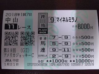 AJCCは、マイネルミラノの複勝と、この馬から馬連4点。ダンビュライト、ゴールドアクター、トーセンビクトリー、トミケンスラーヴァ へマイネルミラノ 8番人気3着ダンビュライト 2番人気1着ゴールドアクター 3番人気11着トーセンビクトリー 6番人気5着トミケンスラーヴァ 7番人気8着(的中 複勝680円×80)2着に粘ってほしかった・・
