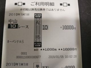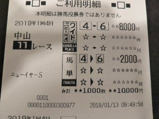 ニューイヤーSは、ワンスインナムーン→ショウナンアンセムの馬単と、そのワイド。ワンスインナムーン 6番人気11着ショウナンアンセム 5番人気10着(ハズレ)