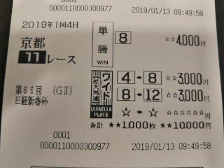 日経新春杯は、ウインテンダネスの単勝と、ウインテンダネスからワイド2点。アフリカンゴールド、メイショウテッコン へウインテンダネス 7番人気11着アフリカンゴールド 4番人気15着メイショウテッコン 6番人気9着(ハズレ)