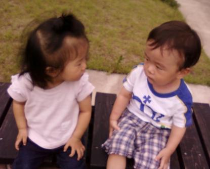 先日、KくんとNちゃんと会って癒されました。こども達はまだ言葉を話せませんが、どのような方法で交流しているのかなあと思いました。とても可愛かったですので、お母様方の了解を頂いて写真をのせっちゃいました。