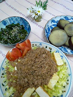 急遽、厚揚げを胡麻油で焼いてその上に味付けしたミンチ(砂糖、しょうゆ、生姜も入れて水とき片栗粉でトロッとさせます)をのせて食べました。下には、春キャベツをしいています。