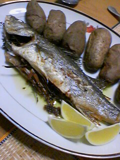 去年の夏にうちの工房でやった食事会。そのときはお料理を作る方に徹していたので、自分で作った料理はほとんどまともに食べることが出来なかった。そんな中でも、一口だけ食べたスズキの香草焼きのおいしさが忘れられないのです。半年以上も経ってしまいましたが、今回は自分のために作ってみました。 <スズキの香草焼きとベークドポテト> <自家製春キャベツとアサリのパスタ> <お魚料理にはやっぱり白ワインでしょう>このスズキの香草焼き、とっても簡単なお料理なのでちょっとだけ作り方を説明しちゃいます。 スズキ1本丸のまま購入(写真のもので40cmくらい、600円もしませんでしたよ。安っ!) ウロコと腸、えらをきれいに取り除く(面倒なら魚屋さんでやってもらいましょう) 腹の中とまわり全体に塩をふる(粗塩やハーブソルトを使ってもいいね) 腹の中にオリーブオイルをたっぷりふりかけて、お好みのハーブを詰める。 (今回はタイムとレモングラスを使いました。ハーブならなんでもOKよ!) 魚の周りにもオリーブオイルをたっぷりかけて、200℃で30分ほど焼く。 (このとき一緒にジャガイモを入れておけば、何もしないで付け合わせが出来上がり!)以上、とっても簡単で、とってもチープで、とっても豪華に見える料理なので、オーブンを持っている人は是非チャレンジしてみて!でも食べるのは、骨があってちょっと大変かも!!!