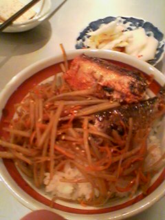 いわし明太なるものを初めて食しました。つまりいわしの腹の中に明太子を詰めたものなんだけど…今まで食べたことがなかったので、興味深々でした。写真はどんぶりご飯の上に網焼きしたいわし明太ときんぴらごぼうをのせたものです。お味の方は、明太の辛さといわしの脂が合わさって、ご飯にぴったりのおかずでした。中に明太が詰まっているからこれだけでもおかずとしては結構リッチですね。どうも九州の方でよく食べられているそうで、関東育ちの私にはなじみのないおかずでした。おいしかったです。。。人に作ってもらったので、なおおいしかったです。