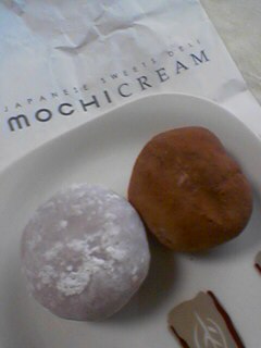 ↑を初めて食べました。友人から「おいしいから食べてみな~!」と言われて、ずっと気になっていましたが、やっと食べることが出来ました。購入したときは冷凍状態で、半解凍、もしくはきちんと解凍してから食べて下さい。とのことでした。食べてみると名前の通り、もちの中にクリームが入っているのですが…もちの部分は大福に似ているかな?で、問題のクリームはフレーバーによって味がだいぶ違ってよく分からないのですが、たぶん白あん。そしてフレーバー白あんの真ん中に生クリームが入っていました。もちと白あんと生クリーム、一緒に口の中に入れると、なんとも気持ちの良い食感でした。食べる前は生クリーム大福を想像していたのですが、んん~、ちょっと違うような気がする。フレーバーがとにかくたくさんあって、和風味以外の物も多く大福という枠から飛び出したスイーツといったところでしょうか?今回私が食べたのは、赤ワイン(写真左)、ショコラ(写真右)、宇治金時、バレンタインナッツ、カフェオレ、オレンジパッションの6種類。個人的な感想としては、和風味よりも洋風の方が意外性があって良かったかな。オススメはカフェオレ!この「もちクリーム」は恵比寿の三越で買うことが出来ます。