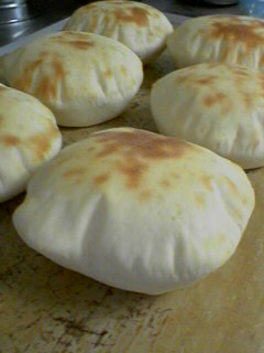 昨日の日記に書いたピタパン。作り方を紹介しますね。<材料(6枚分)>強力粉 300g砂糖 12g塩 5gドライイースト 5g水 180cc<作り方>1.水以外の材料をボウルに入れて軽く混ぜ合わせる。2.水を少しずつ加えながら手でこねる。3.耳たぶの固さよりも少し固めになるように水加減を調節する。4.ひたすらこねる。(私は卓上ミキサーを使って15分くらいですが、手ごねなら20~30分くらいかな~?)5.こねあがった生地を丸くまとめて、油を塗ったボウルに入れる。6.ラップをかぶせ温かい所で90分くらい発酵させる。(1次発酵)7.十分発酵したらガス抜きをして6等分に分割する。8.生地をそれぞれ丸くまとめてぬれ布巾をかけて休ませる(ベンチ)9.打ち粉を打ちながら麺棒で丸く薄くのす。(直径15cmくらい?)10.天板の上に並べて5分ほど生地を休ませる(2次発酵)11.表面に霧を吹いて230℃のオーブンで7~8分焼く。レシピを書いてみると、なんだか難しそうに感じるな~。でも、作ってみれば本当に簡単です。皆さん是非作ってみて下さい。