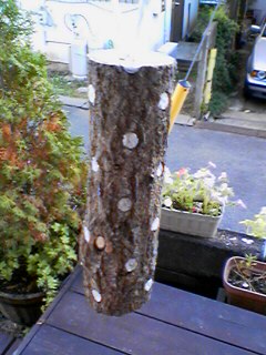 シイタケです。と言っても、シイタケそのものを買った訳ではありません。な、なんと、シイタケ栽培用の原木を衝動買いしてしまいました!まあ、家庭用なので、サイズは長さ30cmくらいと小さめです。あらかじめ穴を開けてシイタケ菌が埋め込まれているので育て方は簡単!まず原木を20時間ほど水に浸して水分を染み込ませる。しっかり水に浸したら、皿の上などに置いて家の日の当たらない場所に置いておく。たまに霧吹きで水をかけて湿らす。以上。これで10日ほど待つとシイタケがニョキニョキ生えてくるんだって!楽しみだね~。いっぱい出来るといいね~。経過はまた報告しますね。