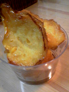 ちょっと作ってみました。なんとなく小腹がすいた時に食べたくなる、フレンチトーストとホットケーキは自分のために作るおやつの代表格です。でも実はこれ、仕事の試作です。フレンチトーストってとっても簡単で材料もシンプルなんだけど、結構奥が深い!今回試作をしていてそう思いました。いつもは自分のために作っているから、あまり考えて作ってなかったかも!そこでおいしいフレンチトーストの作り方を教えちゃいます。材料 卵 1個 牛乳 120cc 砂糖 25g パン 食パンなら1枚くらい フランスパンなら薄切り3枚くらい バター 適量 シロップもしくはフルーツソースなどお好みで! 卵、牛乳、砂糖をよく混ぜ合わせてアパレイユを作る。適当な大きさに切ったパンを入れて、液がしみ込むまで浸ける。バターを塗ったオーブンシートに液のしみ込んだパンをならべる。200℃のオーブンで15分ほど焼く。お好みでシロップやソースをかけて食べる。これだけです。フライパンで焼くよりもオーブンで焼くほうが中までしっかり火が通ってふっくら仕上がるのです。更においしく食べる裏技として、オーブンで焼いたものを冷蔵庫で寝かせて、翌日に表面をフライパンで焼いて食べる。今回試作のために前日仕込み当日温めという事をやってみたのですが、1日寝かすとパンに味がよりなじんでいておいしかったのです。フライパンで焼き直す事によって表面に焼き色を付けることが出来るので、よりおいしさがますのです!どうですか?この秋のおやつにフレンチトーストを作ってみませんか?