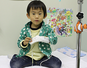 11月の三連休に宮島に行き、帰ってきて二人して熱を出したのですが、花はすぐに良くなったものの瑠生はだらだらと熱と咳が続いておりました。熱は二日おきに出たと思ったら朝には下がってみたり・・・。咳はとにかくずぅ~っとひどかったんです。 その間3度も病院に行き、三度目に肺のレントゲンをとると、何と肺炎ですと!! マイコプラズマ肺炎が疑われております。マイコプラズマ?!なんじゃそりゃ。 保育園に入ってからというもの今まで聞いたこともないようなウイルスや細菌をもらいます。集団だからね、しょうがない。ウイルスに打ち勝つ体を作っていかなければなりませんね。親としての使命です!! 点滴打ったらとにかく元気いっぱいになりました!!!