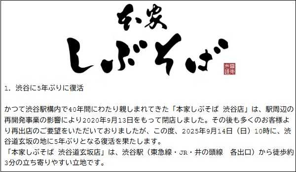 9月14日、場所を変えて5年ぶりに復活した【本家しぶそば】さん。ようやく、行ってきたよいくつか、紹介記事があるけど、東急公式サイト編集部が載せた記事を貼っておこう ” 5年ぶりに復活!再スタートする「本家しぶそば 渋谷道玄坂店」開業直前レポート ”【本家しぶそば 渋谷道玄坂店】 渋谷区道玄坂2-9-10 ホームページ、公式X当店についての紹介文を書くのは面倒なので、上記レポートを読んどいて~今日の私の目的は、 ① 復活した【本家しぶそば】に初訪問 ② 「新そば祭り」 ③ 『さばコロッケそば』 ④ クーポン消化 & 紅生姜のかき揚げとなっている。店頭 昨日(10月17日)から秋田県羽後町産の新そばを使った「新そば祭」スタートメニューは撮り忘れた。 ホームページを参照してね。当店限定商品は3つある。私が注目してるのが ②。 ① 『本家オールスター』 ② 『さばコロッケ』 ③ 『究極おかか飯』 『さばコロッケ』なんて珍しいもんね ■紹介記事 おとなの週末WEB 2025年9月13日 ” リニューアルした渋谷の『本家しぶそば』に「さばコロッケそば」が 店舗限定メニューに登場!【おいしい食べ方付き】 ”この紹介記事によると、『さばコロッケ』は和歌山県の中西部に位置する和歌山県日高町のもの 以前、どこかで書いた紹介文を引用:★。・。・゜☆。・。・゜★。・。・☆ こ こ か ら ・。・゜★。・。・゜☆。・。・゜★私は『コロッケそば』に思い入れはないのだが、たぶん、日本一内容の濃い「コロッケそばの事典的ページ」を作っている自負があるから、話題性のある『コロッケそば』が登場したなら食べておかなくちゃならないの★。・。・゜☆。・。・゜★。・。・☆ こ こ ま で ・。・゜★。・。・゜☆。・。・゜★入店 旧店同様、注文時にレジから厨房へオーダーを読み上げるオペレーションが継承されているのだが、写真はスタッフ(たぶん店長)が席をはずしたタイミングで撮れた口頭注文したがクーポンは番号入力なんだね。誤操作してしまい、スタッフ側で対処してもらった。1階が混んでいたので2階へ。2階は広々。 進捗状況表示モニターがあるが1階の注文番号も載っているので、1階の注文品は機械音声案内(2階でも流れる)、2階の品は2階常駐スタッフからの番号呼び出しとなる。旧店でも使用されてきた木製看板があったカウンター席に荷物棚は見当たらなかったが、荷物入れはある。箸・調味料等は全店共通かな。「おかか飯の食べ方」は当店だけだよね。いただいたのは『さばコロッケそば+かき揚げ(クーポン)』\650。クーポンは30スタンプ使用。かき揚げは別皿でお願いしたら、コロッケも別皿になっていた。やはり、『コロッケそば』らしい画が欲しいからコロッケをON『さばコロッケそば』単体の画像も撮っておこう。安心安定の美味しさ、であるとは言える。本来なら、新そばを楽しむためには『もりそば』のほうがいいと考えているが、今日は『さばコロッケそば』の画を優先。パクリッ、ってやると、やはり、普通のコロッケとの違いがすぐにわかり、さばの味わいが感じられて美味しいコロッケ少ししてから、紅生姜中心のかき揚げもON 【しぶそば】さんのかき揚げは具材が固定されずに季節によって異なる。今回は好みの紅生姜のかき揚げで、これまた、Goodごちそうさまでした~【関連ブログ:旧店】■2020年9月30日: 【閉店】本家しぶそば@渋谷で『本家オールスターズそば(冷)』※ 鉄道系(私鉄)の路麺店訪問履歴のまとめページはこちら。※ 渋谷区内の立ち食い・路麺・イートイン・ファストフード系の店への訪問履歴はこちら。【しぶそば新そば祭(LM2が参加したもの)】■2023年1月24日~1月28日 長野県青木村産「タチアカネ」 ・2023年01月26日 実食@大井町店 ・2023年01月28日 実食@青葉台店■2023年10月17日~10月31日 秋田県折林ファーム産 ・2023年10月23日 実食@池袋店■2024年8月13日~ 秋田県産 ・2024年08月19日 実食@池袋店■2025年8月15日~ 秋田県にかほ市産「階上早生(はしかみわせ)」 ・2025年08月25日 実食@大井町店☆。・。・゜★。・。・゜☆。・。・゜★。・。・☆。・。・゜★。・。・゜☆。・。・゜★2025年10月31日、完売報告。