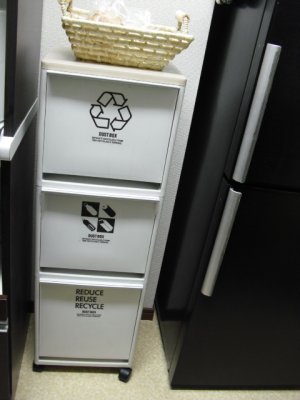 九州に住んでいる友人が新居の台所のレイアウトと、台所に置くゴミ箱に悩んでいるということで、ちょっと恥ずかしいのですが、わが家の台所のゴミ箱を彼女に紹介することになりました。 3段になっています。 一番上を燃やせるゴミ、台所ゴミ用に使っています。 2段目がビン、カン、ペットボトルなどの資源リサイクル 3段目がプラスチック類で資源として使えるもの 私が住んでいる地区はゴミの分別がうるさくて、とても細かく分けているので大変です。結構ちょうど良い大きさで、見た目もスッキリだし使いやすいかな。 冷蔵庫と食器棚の間においています。 その向かい側 レンジガードは友人からのプレゼント キッチンマットは通販で見つけました。音楽好きの私らしいと、遊びに来てくれた人によく言われます。 流し台や調理台の上には何も出していません。引出しや戸棚に収納されています。 何にもないので、「料理してんの?」とよく聞かれますが、毎日、毎日愛する家族のために料理していますよ。 ヨッシーさん(私の友人です)、少しは参考になったでしょうか。