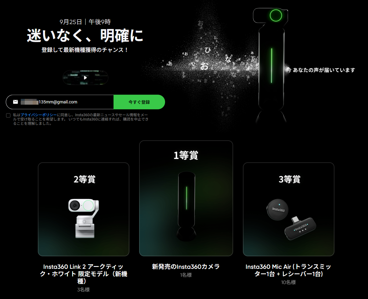 一度登録すると、Insta360のメルマガ、キャンペーン情報、プロモーションをメールで送信してくる