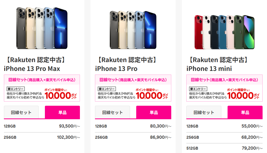 PR認定外の中古品の価格 iPhone13 Pro Max未使用〜中古 iPhone13 Pro Max 128GB/256GB/512GB/1TB SIMフリー 新品バッテリーへ交換可 ダイワン認定整備済品商品価格 88,800円~〜102,800円獲得予定ポイント 4,744pt~5,176ポイント 楽天ポイントは個人差があります実質価格 84,056円~