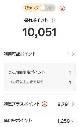 🛒楽天市場 楽天ポイントが使いにくい闇保有ポイントが有るのに、精算時に使えるポイントが殆無いって経験ありませんか?貯めトクモード ←これが原因ONにすると、期間限定ポイントのみが支払いに使われる通常ポイントは使われないため、利用可能ポイントが大幅に減る。しかも、貯めトクONにしても低利息。OFFにしても、これまで貯めていたポイントが利息プラスポイントに入っている場合は、そのままでは使えません。使えるようにしましょうポイント引き出しまでの手順を書きますスマホでの操作支払いに使うには、RakutenPointClubアプリを使って別途ポイントの引き出しが必要です。インストールしていない、アンインストールしてしまった方は再インストール①楽天ポイントクラブを開く②トップ画面右上の「貯めトク(ON)」をタップ③「貯めトクモードをOFFにする」を選択④トップ画面から「利息プラスポイント」を選択⑤ポイントを引き出す⑥トップ画面から「利息プラスポイント」を選択⑦「ポイントを引き出す」をタップ⑧引き出すポイント数を入力し、「確認する」を選択保有ポイント:現在持っている全ポイントの合計(通常ポイント+期間限定ポイントなど)利用可能ポイント:今すぐ使えるポイントのみ(利用条件や設定により制限あり)貯めトクモードなどの設定によって、1万ポイントあるのに実際に使える「利用可能ポイント」が1ポイントという事がある。支払い時に反映されるのは「利用可能ポイント」です。PCでの操作①楽天市場にログインする②保有ポイントをクリックする③貯めトク(ON)→(OFF)する④利息プラスポイントをクリックする ←分かりづらいですよね⑤ポイントを引き出すをクリックする⑥引き出すポイントを数字入力する⑦確認画面どこから引き出せるのかの説明が非常に不親切な楽天市場1日かけて利息計算されます。株が上がってるので投資の方も引き出します。といってもお遊びで1株保有ですがw株が今までにないほど上がっている時に引き出すとよいですね。やがて下落するでしょう。こちらは5日間かけて引き出し完了となります。11月5日は5のつく日で楽天市場のお買い物がおとくですね。