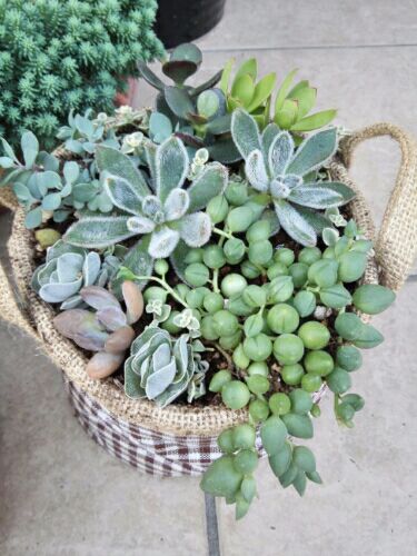 さいたま新都心へ遊びにいった記事のつづきです。黒田園芸で購入した多肉植物で、寄せ植えをつくってみたよ! 購入するときは、フィーリングで自分がすきだなーっというのを複数チョイスしたあと買い物かごの中で並べてみて、合う・合わないを確認するって感じにしてます。容器につかったのは、家にあって、かわいいけど使い道にこまっていた、麻のかご。たぶん、前にプレゼントで頂いたお花の寄せ植えかなにかのカバーだったのだと思います。中にビニールが貼ってあるので、土が染みなくていいかなと。でも水はけはなぜかOK。以前、園芸店で購入した土を8分目くらいまでいれて、多肉植物をぽっとから出して、植える前にあれやこれや試行錯誤。以前、寄せ植えを作る際にしっぱいしたのが、1 にょきにょき上にのびていくタイプ (見た感じ縦長) と、2 全体的にじわじわ大きくなるタイプ をごっちゃに植えると、1が伸びたときに、2が隠れてみえなくなっちゃったことがあるので1ぽいやつは奥に、2ぽいやつは手前に植えて土を足したり、ぎゅっと押して、多肉植物が正面をむくように調整。やっている最中に、多肉さんが土まみれになってしまうので、(手に土がついているから)手をあらう⇒多肉をシャワーで洗い流す⇒てがきれいなうちに植えるって感じ。水はけがいい容器に植えるなら、植えてから水でながしてもOK。水はけないものに植えると、それができないので、寄せ植えてる最中に汚れないように注意です。あとは、ネックレスみたいな垂れてくるタイプは、手前にしてちっちゃめのやつは、他のが大きくなったときに埋もれないように手前に植えました。それでも隙間があいて、かっこ悪いところは、もともと植えていて、あれよあれよ増えていったセダムをぶちっととってきて、隙間にいれてます。そのうち根がでてきます。強いなぁ。すっごいだいたいな我流だけど、こんな感じ。あとで、隙間に、100均で買ってきた肥料をあげるよていです。 でもなーんか違う感じ 黒田園芸さんの完成度の高さは さすがですね ピーチネックレス多肉植物 弁慶草 ベンケイソウ科 ガーデニング 園芸 寄植え 多肉植物アラカルト 【おまかせ6品種セット】【色とりどり 花苗 室内】セダム グランドカバータイプ 多肉植物 ガーデニング 園芸 寄植え セダム・ステップストーンタイプ 【おまかせ6品種セット】【多肉植物 苗 セット 寄せ植え】