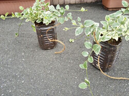 ペットボトルでつくる ハンギングバスケットがあるときき 自分でも挑戦 2リットルのペットボトルを高さ16センチにカット 最初はカッターでだいたい 仕上げはハサミ アイロンで熱して断面をきれいにしようとしたけど、あまり効果はなかったです。 ペットボトルは固めと柔らかめがあるので、お店で強度を確かめてから購入。 底にキリで穴をあけ 側面にも二ヶ所、柵にとりつけるための 穴をあけ、 けっそくバンドを通す予定 ジュート 根巻き用の麻布で袋をつくりました 【G4-n】【3寸苗】鉢カバー【VP-HMS】バラエティーポット/ジュート★サイズS★ 麻布アレンジ☆グリーンネックレス☆多肉植物☆ グリーンテープ(麻布テープ)根巻100cm×20m 関東当日便 完成イメージこんなかんじ 麻布は100均でみつからなくて ジョイフル本田だとサイズ大きいのしかなくて カインズホームで300円ちょいでした 15センチ幅なので ペットボトルのあまりで針をつくり ほどけた部分を糸がわりに 裁縫の要領でぬいぬい 野外におくので、接着剤じゃまずいし、 ホチキスは通らないので。 茶色のヒモはダイソーです。 アクセント用 ヘデラ:ハートアイビー[3号(直径9cm)ポット苗]