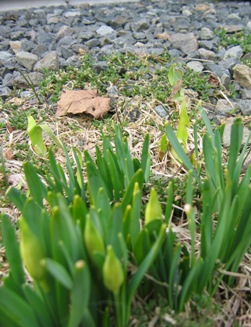 写真に写る水仙が蕾をつけて10cm程に成長。