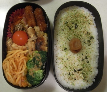 続いて次の日、1月29日分。日曜日ですが、部活部活・・・です。紅実弁当 鮭わかめ混ぜご飯、梅干ナポリタン(冷凍)フレンチフライ卵マヨチキンカツ(冷凍)ブロッコリーマカロニサラダ塩シャケししゃもごぼうとキャベツの炒め物(取り置き)マヨチキンカツドッグ 大森屋 混ぜごはんの素 梅しそ 33g【イージャパンモール】香り高い本格スパイスが魅力の混ぜご飯の素です。土佐はちきん地鶏 土佐はちきん地鶏 混ぜカレー 110g 【02P26Jan12】栄養たっぷり混ぜご飯の素【ひじきごはん 紅鮭入】50g【10P3Feb12】 キッコーマン食品 キッコーマン うちのごはん 混ぜごはんの素 ジャージャー飯 甘辛みそ味 57g*2袋北海道産の焼き鮭を丁寧にほぐし、北海道産昆布と野沢菜を加えた彩り鮮やかな混ぜごはんの素です。まぜこみ 鮭野沢菜ごはん (3合用)[CODE:0040018]国産の原料のみを使用した混ぜご飯の素 かつおの旨みとちりめんのコク♪梅酢の酸味としそが食欲をそそります☆彡混ぜご飯の素 144g浜名湖山吹 混ぜごはんの素「うなつくし」3人前【楽ギフ_のし宛書】・・・・こうしてみると、うまそうな混ぜご飯のもとって、たくさん売ってるのね・・・でも、弁当にはもったいないかもどーせ味わってくれないしさっ