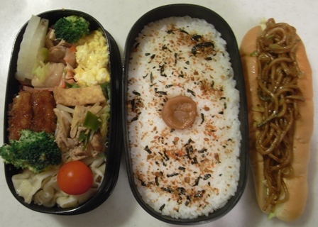 というわけで、今朝の弁当です。といっても、夕べのおかずを取っておいたりして朝作ったものは卵くらい??紅実弁当 ご飯(ラー油ふりかけ、梅干)餃子(焼くだけ)豚と厚揚げのしょうが焼き(取り置き)マヨチキンカツ(冷凍)チーズ出汁卵鶏と大根の煮物(取り置き)ブロッコリーわさびドレッシングミニトマト焼きそば(冷凍)ドッグでもねー、今朝近所の友達から時間の確認で電話があったとき、そこのママはその時に起きて来たみたいな感じで、それではっきり分かったけど子供の出発が早ければ早いほど、家の人は起きてない、弁当もたいして作ってない、ってこと・・・近所の、そこの紅実と同級生の男の子は陸上部なんだけど平日の朝練でもママはおきていない、自分でパン食べて出て行く、って言っていたからな・・・で、紅実に確かめたら、昼食にもパンを持ってくる人が多い、と言っていました。やっぱり。ただ、紅実はパンでは絶対に足りないしもたないし、朝ごはんもどんぶりでご飯を食べないともたないし、それを分かっているので、、、しかし、自分より早起きして弁当作ってもらっているという、その現実はもうちょっと感謝して欲しいわ・・・私は、ちゃんと家を出るときは送り出したい、と思うから勝手に起きているんだけどね。
