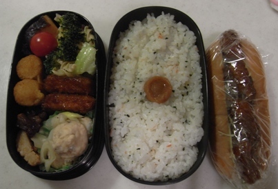 これも結構前の弁当だ・・・1月28日のです。この日も、紅実は朝から部活だった、ってことね・・・紅実弁当 鮭わかめ混ぜご飯、梅干鶏団子と白菜の煮物(とりおき)塩シャケ鶏軟骨から揚げ(惣菜)砂肝ピリ辛(惣菜)コーンコロッケ(冷凍)マヨチキンカツ(冷凍)ブロッコリーマカロニサラダミニトマトマヨチキンカツドッグ最近、本当にご飯ぎっしりおっさん弁当にプラスしてパンも持っていくので、、、、冷凍おかずがどんどんなくなる・・・
