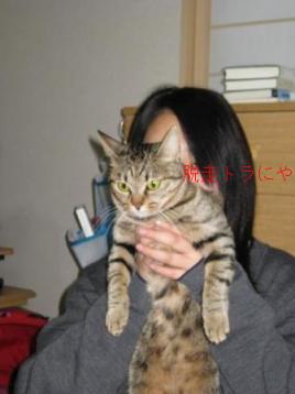 今朝、トラが脱走しました 娘の部屋で一緒に寝ていたのに鍵の開いていたサッシを自分で開けてベランダに出てガレージの屋根におりて庭に下りたとおもわれます大慌てでパジャマの上からコートを羽織って「トラ~~~トニャァ~~トラニャ~~ン!」と大探し7時に近くなって道路に車が多くなってきた。早く探さなくっちゃ!車は危ないトラを拾った公園もぐるっと回って探した。随分遠くまで探したけど見つからない諦めかけたとき家の駐輪場の塀の上にトラ発見「とにゃ~~~どこいってたん~~!。」 私と目が合うと、にゃ~~~と言って逃げていく何で逃げるんだ・・・信じられん・・・そのあと、お隣の塀を移動次に裏のお家の屋根の上に発見!また見えなくなる はぁ~まだ遊びたいんだね 10時半になって疲れ果てたちょっと体が冷えたのでいったん家に戻った 窓から庭を覗くと自転車の横にトラがいる上からトラ!って呼ぶとニャ~と返事をした。急いで階段を駆け下りてそっとトラに近づいた。私がしゃがんでトラおいで!というとにゃぁ~と言いながらすり寄ってきたサッと抱っこしてお家の中へほんまにトラはやんちゃやわぁ。サクラとちびなんてベランダで日向ぼっこしてたって絶対に下に降りたりしないのになぁ~。ワクチンを7種混合にしといてよかった。先生はトラはマメだから脱走するかもしれないからって7種打ってくれた。猫風邪も流行ってるし。どうすれば脱走しないようにできるかなぁ?考えなくっちゃ!うぅ~~ちょっと疲かれました 悪の顔してるぞ・・・トラ!