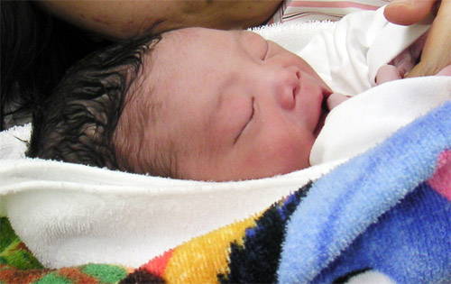 日付が変わって、4月25日午前2時は、徒歩で5分弱(と~っても近いのです)救急センターの受付に到着し、名前を伝えると看護師さんが車椅子で迎えに来てくれました。車椅子に乗るまでもないよなぁ~と思いながらも、ちゃっかり車椅子に乗った私産科の病棟に到着するまでにも、時折痛みが着たので・・・やはり、車椅子で正解だったのかもぉ陣痛室(陣痛室と言っても、分娩室の手前にカーテン1枚でベットが置いてあるだけ。)に案内され、病衣に着替え、モニター装着ドクドクドク・・とベビの心臓はしっかりと動いていました内診のために分娩室へ移動。助産師さん:「子宮口6cmだねぇ。よくここまで我慢したねぇ。朝には生まれるんじゃないかなぁ。」私:「え~ホントですかぁ(陣痛たいしたことなかったんですよぉというか、陣痛だと思っていなかった)」助産師さん:「このままここ(分娩室)で、頑張ろう!旦那さんも居るから大丈夫ねぇ~。何かあったら呼んでください。」それから間もなくして、徐々に陣痛の波がやってきた。背中や腰をダーに擦ってもらいながら・・・・ダーが一生懸命に「ヒーヒーフー」と呼吸をリードしてくれる。。。3,40分に1度助産師さんが見に来てくれるものの・・・ダーと私は2人きりで分娩室に残されるのでありましたいや~、出産ってこんなに放置されるとは知らなかったまさかこのまま出産になるとは思っても見なかったので・・・用意不十分ダーには、鼻づまりがひどくなりつつあったので、鼻のスプレーと飲み物を買いに一度に戻ってもらいました。徐々に陣痛の痛みはやってきて。。陣痛のいきみ逃し用の椅子に座ってみるものの、どうも合わない・・・・。分娩台の柵にしがみついている方が、、、どうやらよいようで。痛みが来るたびに、思いっきりしがみついておりました。でぇ。。。なんせ夜中。眠いのであります(ダーも時折・・・ウトウト)陣痛の合間には、思いっきり睡魔がやってきて、ウトウトで、次の痛みの波で起きる体は眠たがっているから、このウトウトの後に来る痛みが、強烈に感じられるのよぉ~。時折、『うぉ~』と奇声を発しながら、柵にしがみついたり。だんだんお尻のほうがムズムズしてきて、いきみ逃しがしんどくなりつつ。お尻をベッドにつけて座っている姿勢が楽になってきました。そうこうしているうちに、あれれ・・・陣痛の間隔が延びているような助産師さん:「あれ?!陣痛が遠のいてる?う~ん。やっぱり、昼頃までかかるかなぁ~。」私:・・・・こんなの昼まで耐えられません。。。お腹をさすりながら、お願いだから早く出てきてくれぇ~。と心から願ったのであります。その後、いきみ逃しができない状態になってきて、え~こんな状態が昼までなんて・・・考えられませんその瞬間「プチッ」と音がして・・・もしや破水私:「(助産師さんに)破水してみたいなんですけど・・・」助産師さん:「そうだねっ。今、準備するから待っててねぇ~。」・・・・・・・この間、数分なんだろうけど・・・長く感じたわぁ~。なんせ、いきみたくて、出したくて・・・しょうがないと言うかんじっ準備が整い、いざ出産最初は、なかなか思うようにイキムことができなかったものの、イキムこと数回。会陰切開しますよぉ~とドクター。切開の痛みは全く感じないものの、イキミで傷口が広がるときに少々ヒリヒリ感が。これは、早く出さないとぉ~切開後2回目のイキミで、ベビは頭を出したものの・・・肩がひっかかり・・・助産師さん:「もう1回頑張ろう」この頃になると、イキミの力のかける場所がわかってきて、長くイキムことができるようになってきました。で・・・・産まれたぁ~~元気な男の子取り上げられた姿は、頭がピーナッツ&お目メぇ~がまるで、宇宙人ベビは、『ウギャー』と響き渡るようなものすごい大声で泣くではありませんかベビの元気な泣き声を聞いて安心しました。なんとぉ~破水してから約30分ほどで、ベビとのご対面 腰があまり良くないので、難産を覚悟していたのに、超安産でした陣痛時間も、病院に着てから約5時間。体力消耗も少なく、元気元気一番びっくりしたのは、出産は「鼻からスイカを出す感じ。」と聞いていて、痛くないわけがないだろう(どんだけ痛いだろう・・・と実はビビッていた)。と思っていたのですが、いきんでベビが出てくるときに、全く痛みを感じなかったことこれには、びっくりしましたぁ~出産直後にも関わらず、これなら何人でも産めるかもぉ~と思ってしまった ダーは・・・お仕事お仕事。もともと立ち会い出産を予定していたので、ベビが生まれた後は、沐浴のビデオ撮影やら、へその緒を切るので大忙し。私は、分娩台で処置をしてもらいながら、ダーがへその緒を切るシーンをビデオ撮影しておりました。私は生まれたことの喜びが大きくて、疲れを全く感じませんでした女性のDrに、話をしながら処置してもらい、女性のDrで良かったなぁ~と思いましたその後、ベビは検診等で別室に行き。